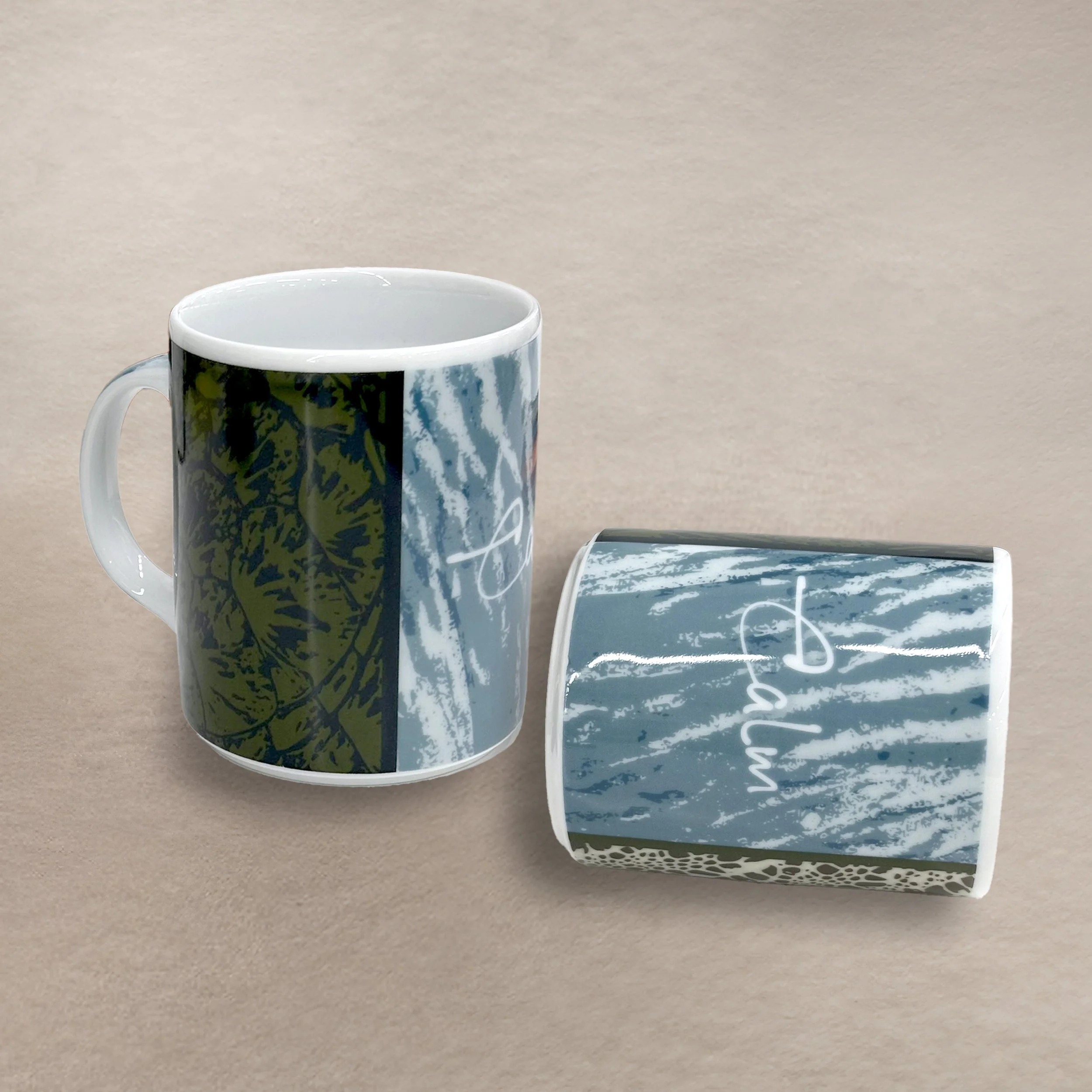 Decorazioni fluide e sfumature marine in blu e toni caldi, ispirate ai movimenti dell'acqua e della sabbia soffiata dal vento.